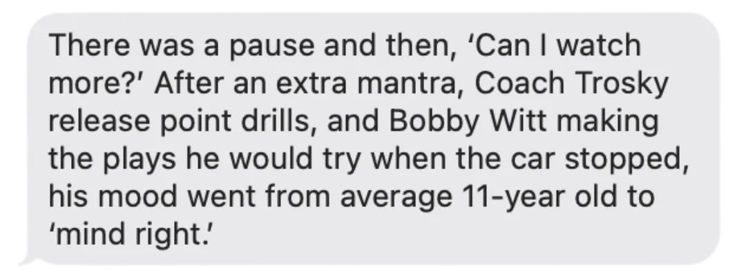 I TOOK MY SON THROUGHTHE 5-STEP PRE-GRAM ROUTIN TODAY. HE GOT IN THE CAR FOR A 1-HOUR DRIVE TO THE FIRST GAME OF THE WEEKEND. IT WAS A NORMAL 11-YEAR OLD MIX OF VINEGAR, MOMENTARY FATIGUE AND OPTIMISM. 30-MINUTES IN HE TOOK MY PHONE. IT TOOK 10-MINUTES TO GO THROUGH THE STEPS.WHEN HE WAS DONE, I ASKED, HOW DID IT GO? – GOOD. HOW DO YOU FEEL? – READY.
